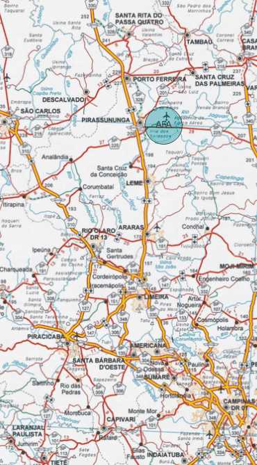 Veja, marcadas em amarelo, as cidades de Porto Ferreira, Pirassununga e Leme, situadas ao longo da Rodovia Anhanguera (que liga São Paulo a Ribeirão Preto).